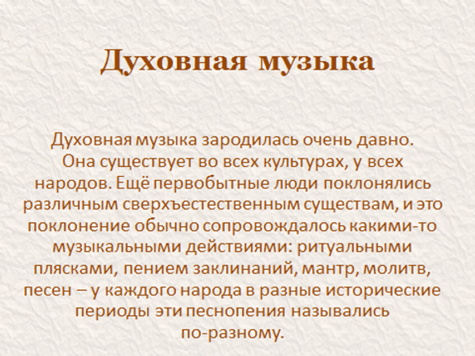 Духовная музыка — музыка религиозного содержания, исполняемая в храме, церкви или в быту. Духовную музыку называют также культовой, т.к. она посвящена религиозному культу.